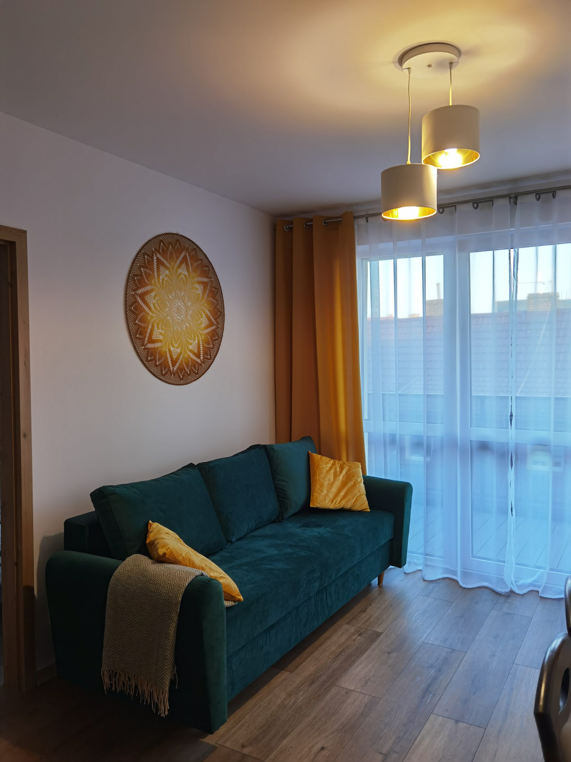 Wykończenie i wyposażenie apartamentu staramy się utrzymać na jak najwyższym poziomie. Apartament składa się z salonu z aneksem kuchennym, gdzie w części wypoczynkowej znajdziemy wygodną rozkładaną kanapę, komodę oraz telewizor z Wi-Fi.